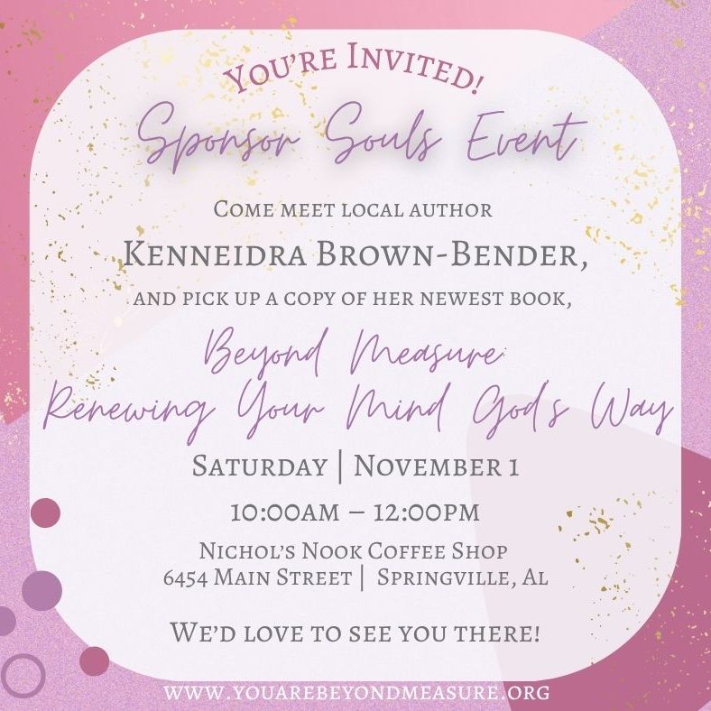 Join us for an inspiring morning at Nichol’s Nook Coffee Shop as we celebrate the release of Kenneidra Brown-Bender’s newest devotional, Beyond Measure: Renewing Your Mind God’s Way.